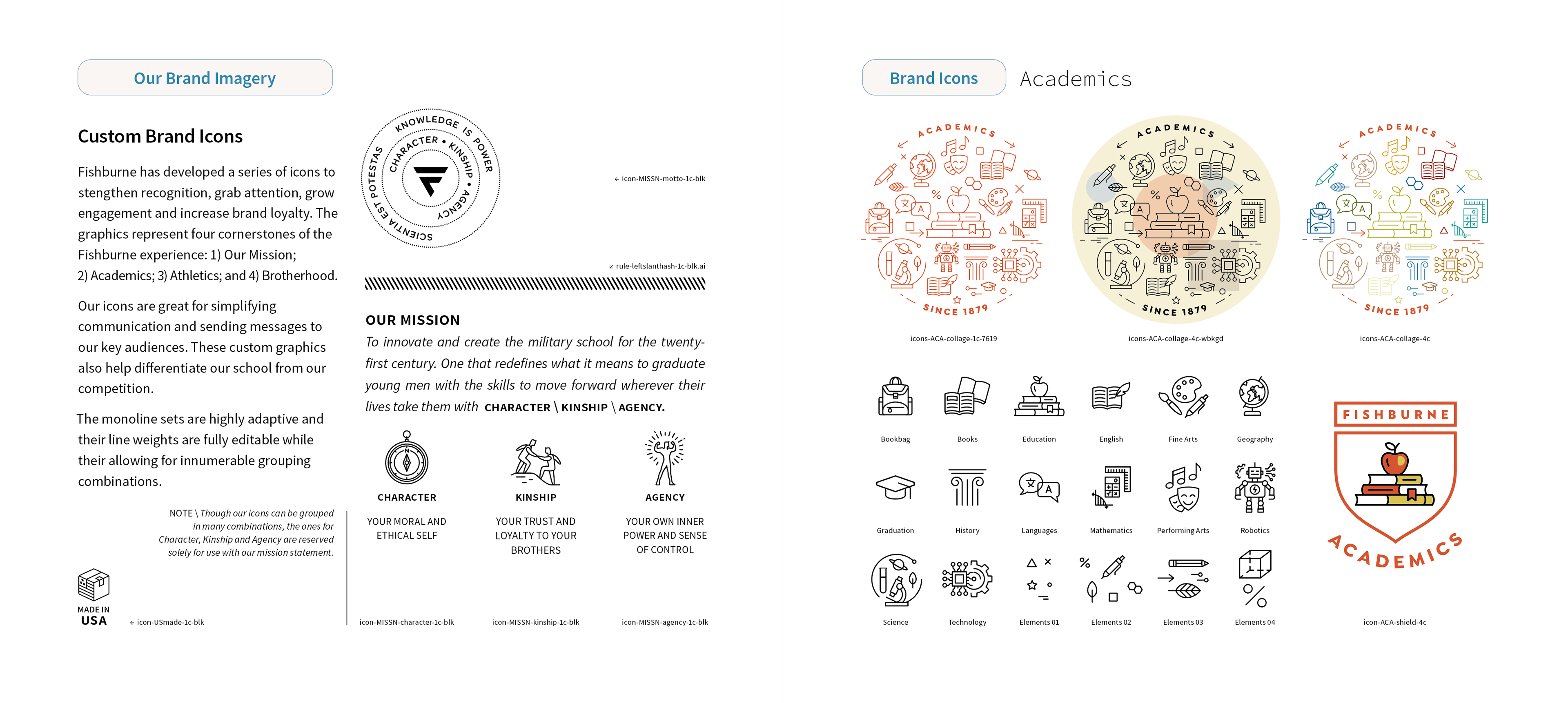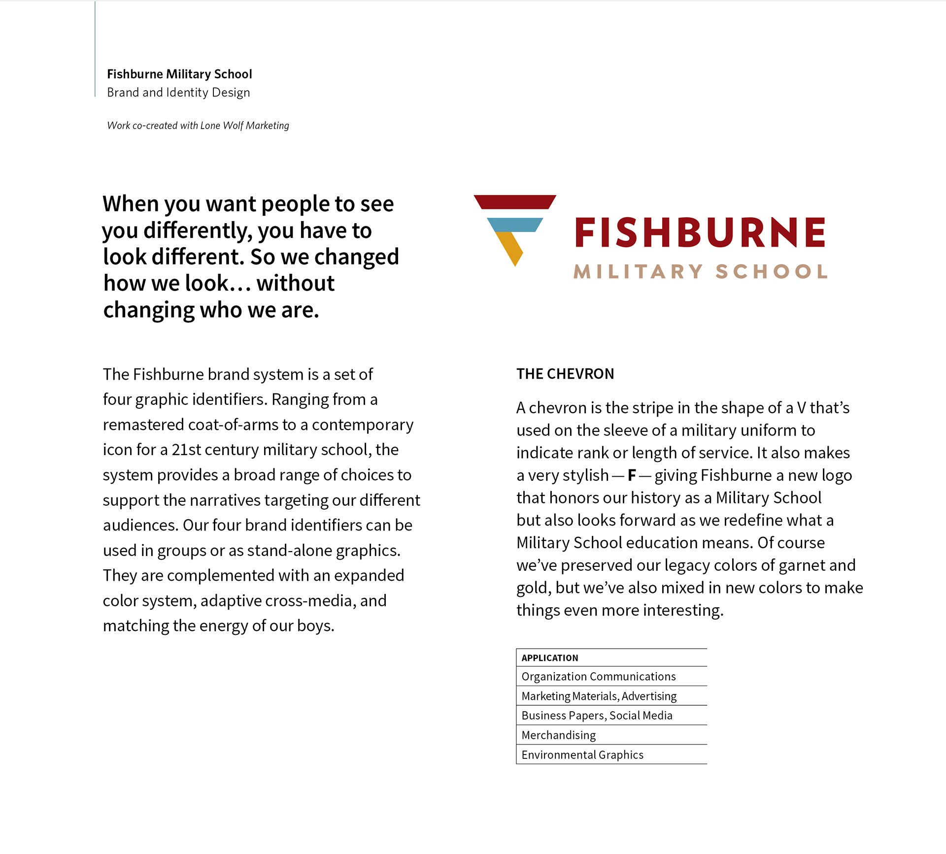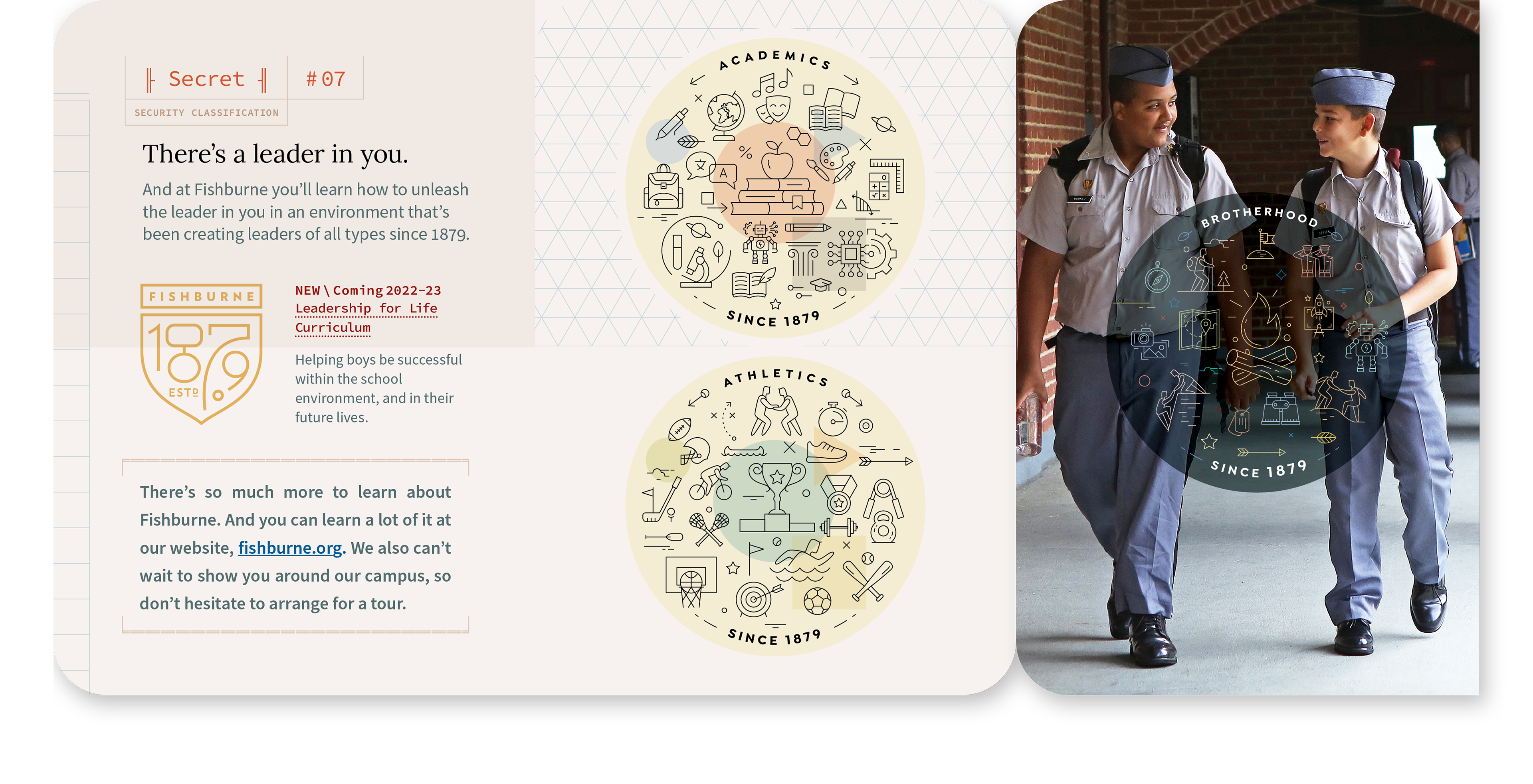 With the Board’s approval of BLTdesign’s new Fishburne logo and identity, development began on a brand guidelines book providing Board, staff, alumni, donors and 3rd party advocates a resource to help them support the new brand communication efforts. The book shares key insights discovered during the brand research and outlines Mom, Dad and boy’s journey-of-understanding before they decide to commit to enrollment at Fishburne.