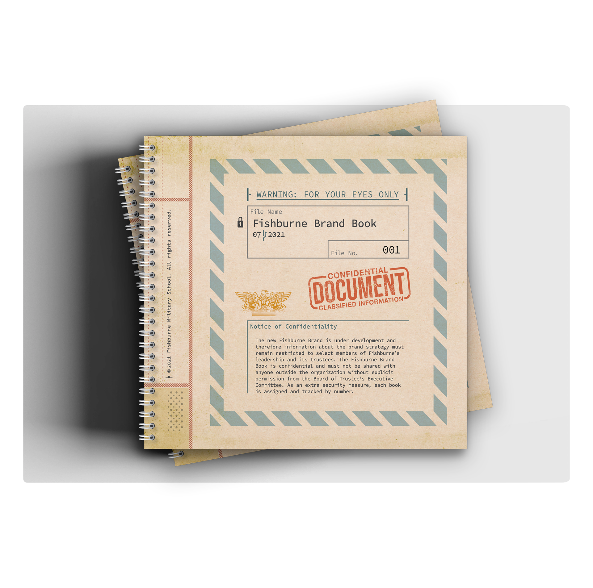 Shown below: Cover of a limited edition (30 books), pre-brand launch, work-in-progress Fishburne Brand Guidelines for the eyes of the Board and select staff borrowing from US WWar II era military reports. Upon redactions, recommendations and amendments, much of the insights within this now approved booklet was incorporated into the Parent Book to increase Mom and Dad understanding of who and what Fishburne is about, and the merits of a military-style education for many boys. Following are excerpts of the ‘designer’ portion of the book.